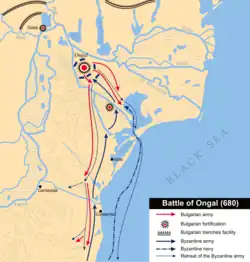 The Battle of Ongal took place in the summer of 680 in the Ongal area, an unspecified location in and around the Danube Delta near the Peuce Island, present-day Tulcea County, Romania. It was fought between the Bulgars of Asparuh of Bulgaria, who had recently invaded the Balkans, and the Byzantine Empire, which ultimately lost the battle. The battle was crucial for the creation of the First Bulgarian Empire.