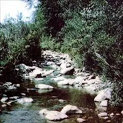 About 6 miles (10 km) from the fort, the road dipped more than 50 feet (15 m) into a marshy ravine with a stream at the bottom that was about 3 feet (1 m) wide.[14] Seneca chiefs Sayenqueraghta and Cornplanter chose this place to set up an ambush;[15] the Royal Yorkers waited behind a nearby rise and the Iroquois concealed themselves on both sides of the ravine. The plan was for the Royal Yorkers to stop the head of the column, after which their Indigenous allies would attack the extended column.[14] At about 10 am, Herkimer's column descended into the ravine, crossed the stream, and began ascending the other side with Herkimer on horseback near the front.[11]