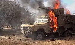 As they ran out of ammunition, many SNA troops discarded their weapons and uniforms, then retreated into the bush from pursuing insurgents. Al-Shabaab fighters seized the Osweyne camp and captured several SNA prisoners of war.[9] Large amounts of vehicles were captured by Al-Shabaab fighters, but most the operable armored personnel carriers (APCs) the SNA had left behind were destroyed by helicopter gunships.[8]