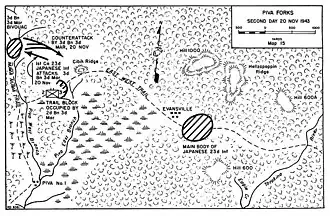 On 19 November, the 3rd Battalion, 3rd Marine Regiment—accompanied by light tanks—took up positions in front of the 129th Infantry Regiment.[7] An artillery barrage by the 12th Marine Regiment preceded the attack; after it had ceased the 3rd Battalion, 3rd Marine Regiment flanked the Japanese position, routing the defenders and forcing them out of their positions. Sixteen Japanese dead were found and almost 100 foxholes located; the size of the position indicated that at least a reinforced company had occupied it. After this, a roadblock and a defensive perimeter were established at the junction of the Numa–Numa Trail and the Piva River to defend against a potential Japanese counterattack.[7] Meanwhile, the 1st Battalion, 3rd Marine Regiment and the 1st Battalion, 21st Marine Regiment advanced to the 3rd Battalion, 3rd Marine Regiment roadblock. The 3rd Marine Raiders also moved forward for support and the 2nd Battalion, 3rd Marine Regiment—under the command of Lieutenant Colonel Hector de Zayas—moved behind the Numa–Numa Trail roadblock and was sporadically shelled by the Japanese using 90 mm mortars.[7]