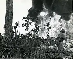 The 2nd Battalion, 3rd Marine Regiment suffered 70 casualties in moving only 250 yd (230 m). During the morning, the Marines were forced to undertake eight water crossings of the same stream as it zigzagged across their axis of advance.[21] At each bend in the stream, the Japanese had established a number of pillboxes which were set out in triangular formation; before the Americans could advance they had to neutralize each of these. Flame throwers, which had been brought up by engineers attached to the assault companies, were employed in this task. The Japanese—aware of the capabilities of the flame throwers—concentrated their fire on the engineers, inflicting heavy casualties upon them as they attempted to get close enough to direct the flame into the bunkers.[21]
