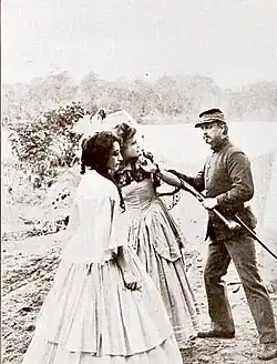 The climactic battle scene in the film depicted Miriam Cooper's character—the "southern girl" Jessie—trapping Federal troops on a bridge by setting it on fire. According to a news item in the Kalem Kalendar, Director Buel wanted to add a true "touch of realism" to his production, so prior to filming those sequences he obtained permission from local government officials in Duval County, Florida to actually burn down the old bridge outside Jacksonville, a bridge situated near Pottsburg Creek and described to be "half a mile in length".[18] As part of Buel's request, Kalem agreed to pay the full cost for constructing a new structure.[18] The filming of the old bridge's destruction provided, in the director's words, a "thrilling effect" on the screen, with highly dramatic scenes full of "smoke and flames".[18] The motion picture company's home office in New York City later reported, "The fact that the Commissioners granted this favor, attests [to] Kalem's popularity in Jacksonville and the hearty co-operation of the authorities".[18]