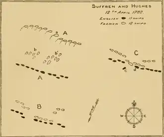 The Battle of Providien was the second in a series of naval battles fought between a British fleet, under Vice-Admiral Sir Edward Hughes, and a French fleet, under the Bailli de Suffren, off the coast of India during the Anglo-French War. The battle was fought on 12 April 1782 off the east coast of Ceylon, near a rocky islet called Providien, south of Trincomalee.[5]