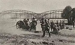 Meanwhile, Alfred Fletcher's column, Valters fon Mēdem's corps and the Strike Group under the leadership of Hanss fon Manteifels-Cēge captured Zasulauks in the morning due to a rapid attack and reached the Daugava bridges around 11:00 and started invading Vecrīga. The appearance of Landeswehr was a surprise to the Bolsheviks since they thought that the fight was continuing in the Tireļpurva area.[7] The small attacking group began to be fired upon from building. Soon after crossing the bridge a large unit of 10 soldiers came with a light cannon and 2 machine guns under the leadership of von Manteifel and Valters fon Mēdem, went to the Riga Citadel, where there were hundreds of imprisoned Bolsheviks, and in the attack Mateifelis falls, but manages to reach the Citadel and free the prisoners.