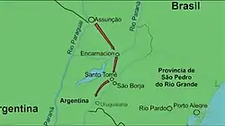 Even after the disastrous defeat at the Battle of Riachuelo, the Paraguayan soldiers continued advancing overland towards Rio Grande do Sul, under the command of lieutenant colonel Antonio de la Cruz Estigarribia. A few days earlier, on June 8, the Paraguayan column, organized by major Pedro Duarte and numbering about 10,000 men, was in the Argentine village of Santo Tomé, close to 8 km (5.0 mi) from the border with Brazil. Along with them were 5 cannons, 20 canoes, and 30 carts with various supplies.[1]