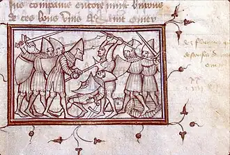 The Battle of Saint-Omer, fought on 26 July 1340, was a major engagement in the early stages of the Hundred Years' War, during Edward III's 1340 summer campaign against France launched from Flanders. The campaign was initiated in the aftermath of the English naval victory at the Battle of Sluys but was far less successful than Edward had hoped. At Saint-Omer, the heavily-outnumbered French men-at-arms, tasked with defending the city and awaiting reinforcements, unexpectedly defeated the Anglo-Flemish forces on their own. The allies suffered heavy losses and the French captured their camp intact, taking many warhorses, draft animals and carts, all the tents, huge quantities of supplies and most of the Flemish standards.[4] Edward's campaign of 1340 had begun badly. On the bright side, the loss of several thousand men was bearable, as the survivors, which included most of the precious English longbowmen, eventually rejoined him at Tournai. The defeat had serious strategic consequences. It exposed southern Flanders to the wrath of Philip VI and enabled the French to concentrate their forces against the main army of the coalition in the siege of Tournai.[4]