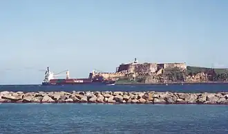 ![]() Ship entering the San Juan Bay, in front of Fort San Felipe del Morro - view from Isla de Cabras. | |||||||