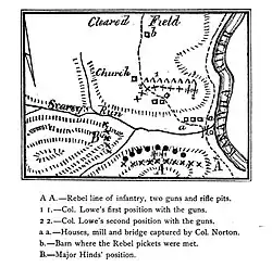 The Federals under Lowe advanced along both the Bill's Creek Road and the River Road towards Scary. At 1:30 pm, they reached and drove in Confederate pickets at Little Scary Creek and approached the main Confederate positions at Scary around 2:00 pm. Lt. Col. George S. Patton, (grandfather of the famous George S. Patton of World War II), commanded the Confederate line behind Harlem Creek, 2 miles from the main Confederate camp. The Union forces quickly engaged the Confederates, launching artillery barrages and musket volleys for an hour.[4]