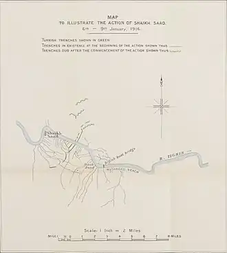 The Battle of Sheikh Sa'ad (Turkish: Sağ Sahil) occurred between 6–8 January 1916 during the Mesopotamian Campaign of the First World War. The battle took place along the banks of the Tigris River between the Anglo-Indian Tigris Corps and elements of the Ottoman Sixth Army. The engagement was the first in a series of assaults by the Tigris Corps to try to break through the Ottoman lines to relieve the besieged garrison at Kut.