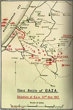 The 159th Brigade on the left was ordered to advance on Ain Kohle, but could not move forward. Several urgent requests were made during the day for a mobile reserve of a brigade or a regiment, but they were denied by Chauvel, who could not spare the reinforcements.[113] Although the attack by the 53rd (Welsh) Division had been very confused, suffering a "bloody defeat" instead of a "conquest", the 19th Division was stopped from moving back to reinforce Tel esh Sheria. The continuing threat of an attack up the road to the headquarters of the Seventh Army at Hebron and on to Jerusalem, was maintained by the repeated attacks on Tel el Khuweilfe by the 53rd (Welsh) Division. By the end of the day, the Ottoman defenders had succeeded in defeating the British infantry attacks on Tel el Khuweilfe, and continued to hold Tel esh Sheria, but they had begun to evacuate Gaza.[118] At nightfall, Chauvel issued orders for the Anzac and Australian Mounted Divisions to begin their advance northwards via Sheria towards Jemmameh and Huj, while Barrow commanding the Yeomanry Mounted Division was to take command of the force at Tel el Khuweilfe, including the 53rd (Welsh) Division.[107]