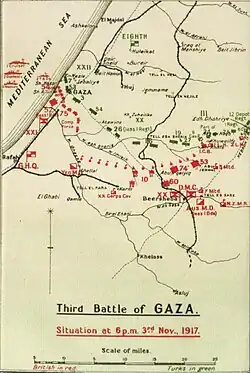 Although the Ottoman forces had been driven out of Beersheba, they had not been dislodged from the rest of the Ottoman defensive line stretching westward to the Mediterranean coast, which had been destabilised and "thrown back on its left, but not broken".[22]The remainder of their line continued to be strongly defended, particularly at Hareira, Sharia and Gaza, but the loss of Beersheba had placed EEF mounted units across the Beersheba to Hebron and Jerusalem road, and three Eighth Army infantry battalions were sent by Kress von Kressenstein to reinforce the Ottoman troops fighting at Khuweilfe. They were to protect the only metalled road heading north in the region, which ran direct to Hebron and Jerusalem only about 50 miles (80 km) to the north, from the threat of an EEF mounted advance.[17][22][23][24][25][26]