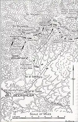 On the right of the Ras en Naqb position, the 2nd Light Horse Brigade continued fighting towards Edh Dhahriye on the main road north from Beersheba to Hebron and Jerusalem. The brigade was deployed on a front of several miles, sending patrols round the Ottoman flank to within 1 mile (1.6 km) of the road, 2 miles (3.2 km) north of Edh Dhahriye, from where they could see the busy motor traffic heading towards Hebron and Jerusalem. However, a general advance, which began at 10:15, was unable to make any gains because the brigade was too thinly stretched over a wide area. This attack was not pressed, but a couple of days' supply of water was found.[58][84]
