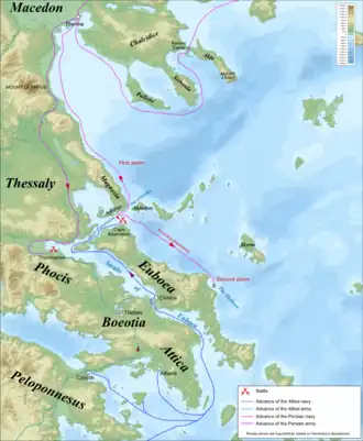 Map showing Greek and Persian advances to Thermopylae and Artemisium