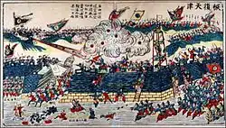 Thousands of Boxers from the countryside converged upon Tianjin, and on 15 June 1900, they rampaged through the walled city destroying Christian churches and killing Chinese Christians. On 16 June, a mob of partially armed Boxers advanced on the foreign settlement. They were driven off by volleys of fire from the defenders.[5] The Chinese army near Tianjin stood by and awaited orders from Beijing to either support the Boxers or protect the foreigners. As a result of the 17 June attack by the foreign armies on the Dagu Forts, the Qing government of China took the side of the Boxers and ordered the army to attack the foreign settlements. The Chinese began bombarding the foreign settlement with artillery on 17 June. The Western and Japanese soldiers defending the foreign settlements were initially stretched thin, and all communication with the coast and the allied fleet was cut off for several days.[6]