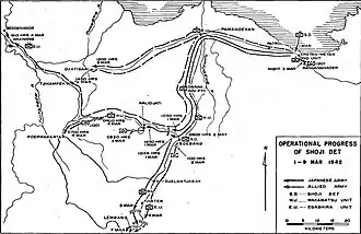 After receiving reports of the Japanese attack, Pesman deployed his reserves to Tjiater.[26] They were however delayed by a traffic jam in the road leading to the defenses.[27] As dusk approached, the reinforcements arrived in the vicinity, but were prevented from entering the second line due to some Japanese soldiers who managed to infiltrate the lines.[28] As more Dutch soldiers arrived, the men in second line were eventually evacuated before daylight the following day.[29] A new line of defense was established behind the fortifications, manned by some 950 soldiers.[30] Behind the defense lines, there were just 400 inexperienced soldiers defending the southern exit of the pass.[31] The Japanese had captured five pillboxes, and opted to pause their attack for the day. A KNIL motorized column moving north from Bandung was also intercepted by Japanese aerial bombardment.[22]