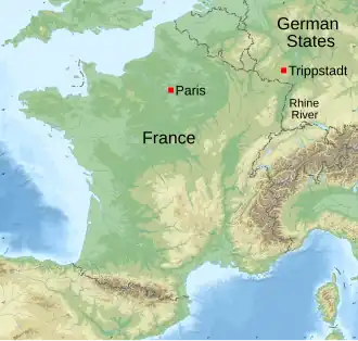 The Battle of Trippstadt was a relatively minor French military action in 1794 during the War of the First Coalition. The clash between the French Republican forces and the armies of Prussia and Habsburg Austria was fought over several days (13 to 17 July) in the lower Vosges Mountains in the German states west of the Rhine River. Fighting occurred across a wide front and included action in Kaiserslautern, Trippstadt, Schänzel and Neustadt and along the banks of the Speyerbach River.