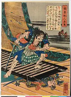Gochi-in no Tajima, who is said to have strode alone on the bridge, dodging arrows and using his Naginata to cut through those that flew straight at him (leading to him being named "the arrow cutter").[5][17]