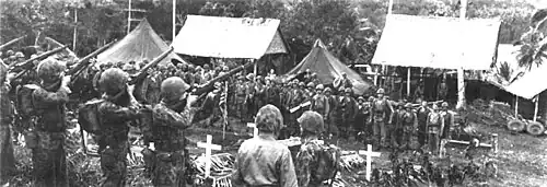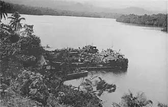 The Marines stopped short of the junction of the Tetemara–Tombe trails, close to their objective (Viru Harbor) on the evening of 30 June, and prepared to launch their attack the following day. Currin's men subsequently launched two-pronged attack the following morning; two platoons were detached to attack Tombe from the northeast, while the rest of the regiment skirted around the harbor to the north, crossing the Viru, Tita and Mango Rivers, and assaulted Tetemara from the southwest.[23] The outpost at Tombe was quickly overwhelmed around 08:45 on 1 July, while the main body of Marines drove the Japanese out of Viru in a running battle that lasted until the early afternoon. They were supported by preliminary air attacks by 17 US Navy Dauntless dive-bombers, while landing craft with combat supplies (ammunition and fuel) entered the harbor to ensure rapid resupply. As Hara's troops withdrew into the jungle, the Marines began constructing defensive positions to wait for reinforcement.[24][25]