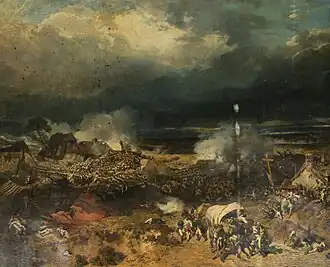 On 16 October, Fromentin's two divisions on the left flank and Balland's division in the center skirmished all day. Bellegarde and Clerfayt held the bulk of their strength in their main positions. Jourdan mounted the main French assault against the height of Wattignies in three columns from Dimont, Dimechaux and Choisies.[42] The main attack was also supported by additional artillery.[31] When an early morning fog lifted in mid-morning, the French artillery opened a barrage on Wattignies. Duquesnoy's division formed the two right columns while Jourdan's detachment made up the left column.[43] After being driven back twice by heavy fire, the French columns forced their way into Wattignies in the early afternoon. A counterattack from the northwest briefly pushed back the French, who were rallied by Jourdan. More French troops came up and defeated the Austrian attack. Duquesnoy sent Gratien's brigade forward but it was caught by Austrian cavalry in the open and thrown back. By this time, the French had dragged a battery up to the Wattignies heights to support the infantry. Under pressure from infantry and artillery, Terzi's division recoiled to the north.[44] On the right of Duquesnoy, Beauregard's division attacked Obrechies, which was defended by Hadik with two battalions of regulars and eight squadrons of cavalry. As the French began breaking into the village, Hadik launched attacks from three directions at once, routing Beauregard's men. The French abandoned five cannon and fled back to Solrinnes.[45] According to one observer, they did not stop until they reached Solre-le-Château.[27]