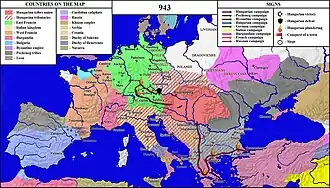 ![]() The Hungarian campaign in Europe in 943. Battle of Wels marked. | |||||||