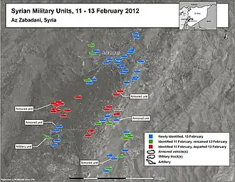 On 4 February, it was reported by activists that the Syrian army was shelling the area with mortars and firing on FSA troops with heavy machine guns, and had started to storm Zabadani's outskirts.[15][16] The Local Coordination Committees of Syria said that 300 armored vehicles, including 100 tanks were involved in the offensive. This report could not be verified independently.[8] The SOHR, another activist source based in London, said to the AFP that hundreds of armored vehicles assaulted the city of Zabadani on 6 February.[17] According to activist videos Zabadani was still under shelling on 7 February.[18]