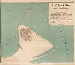 In 1517, the Portuguese governor of India Lopo Soares de Albergaria sailed a large armada to attack Ottoman positions in the Red Sea. Having failed to capture Jeddah, short on water and supplies, the fleet withdrew, having called at Kamaran Island before sailing to Zeila. At the time the Sultanate of Adal was involved with most of its forces in a war with Ethiopia, a Portuguese ally, and Mahfuz the governor of Zeila, had recently been killed.[1] Having been warned that the Portuguese fleet was incoming, the inhabitants evacuated all women and children, and a number of warriors remained behind to defend the city and the ships left behind. They gathered on the beaches to resist a Portuguese landing.[2] Seeing this, Albergaria determined to capture the city and landed a contingent of men.[2] The Portuguese wrote that "The city is of good size and flat, by the edge of the sea. It's made of stone and lime houses with terraced roofs like those of Aden. Its inhabitants are moors and merchants of great trade and for the most part are black, men as well as children, and some white, and they treat each other well".[2]