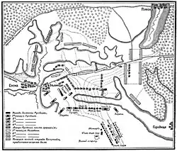 After collapsing the Russian advance, Poniatowski organised an attack group from division Wielhorski units.[8] This group contained three infantry battalions from regiments Potocki, Malczewski and ordnance ostrogocka, Brigade National Cavalry under command of Dzierżek, and regiment front watch under command of Józef Lubomirski. The group had to attack the Russian right wing. Morkov, who watched the preparations, concentrated most of his formation against the group. Polish cavalry successfully fought the Russian cavalry and forced them to withdrawal. But when Wielhorski met the enemy infantry, he stopped the advance because his infantry was weaker than the Russians and inexperienced. About 5 p.m. Morkov, who did not get relief from Kutuzov, withdrew.[9]