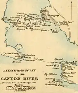 North Wangtong's defences were the Wangtong Fort (Hengdang) on the eastern side and the 40-gun Yong'an Fort on the western side, flanked by a field work of 17 guns.[13] A boom connected South Wangtong to the South Anunghoy Fort, where it was heaved or lowered by a windlass. It was composed of four parts of a chain cable supported by large wooden rafts.[26] A passage was not forced through it until after the forts were taken.[10] The Wellesley (Commodore Bremer's flagship) and Druid targeted the southwest batteries, while the light division under Captain Hebert—comprising the Calliope, Samarang, Herald, Alligator, Modeste, and Sulphur—targeted the northwest and southeast batteries of the island,[27][28] which had 2,000 Chinese defenders.[29] In less than an hour, the batteries were silenced.[27] At 1:30 pm,[30] under Major Thomas Simson Pratt, 1,037 troops from the 26th and 49th regiments, 37th MNI, Bengal Volunteers, and Royal Marines landed on the rear of the southwest fort from the steamers Nemesis and Madagascar.[27][29] Within minutes, the British captured the island and 1,300 Chinese surrendered.[27] An estimated 250 Chinese were killed or wounded in Wangtong[24] and 167 guns were captured.[31] In total, five British were wounded[13][32] and 339 artillery pieces were captured that day.[33] Lin wrote in his records: "I got home at the Hour of the Monkey [3 p.m.] ... and when night came heard that the Bogue forts and those on Wantung Island were being invested, preparatory to attack, by the English rebels. I at once went with Deng to Qishan's office and at the Hour of the Rat [11 p.m.] we heard that the Wantung, Yung-an and Kung-ku forts have fallen. All night I could not sleep."[9]
