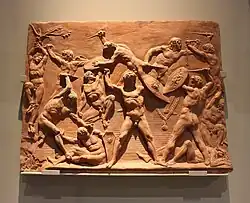 The Battle of the Nudes or Battle of the Naked Men,[1] probably dating from 1465–1475, is an engraving by the Florentine goldsmith and sculptor Antonio del Pollaiuolo which is one of the most significant old master prints of the Italian Renaissance. The engraving is large at 42.4 × 60.9 cm, and depicts five men wearing headbands and five men without, fighting in pairs with weapons in front of a dense background of vegetation.