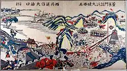 Two forts remained on the south side of the river. The Allies turned all their guns, and the guns in the two Chinese forts they had captured, on these two forts. They blew up another powder magazine in one, and shortly afterwards the Chinese soldiers abandoned the forts. The Allied ground force then crossed the river and captured the forts with almost no opposition. The battle of the Taku Forts was over at 6:30 a.m. The Allies had suffered 172 casualties among the 900 soldiers and sailors engaged.[15] The number of Chinese casualties is unknown, but the forts were described as flowing in "rivers of blood".[16] However, Robert B. Edgerton says that Chinese casualties were "probably not heavy".[10]