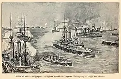 A few miles offshore in the Yellow Sea were a large number of Western and Japanese warships. On June 15, Chinese forces deployed electric mines in the Hai River before the battle to prevent the Eight-Nation Alliance from sending ships to attack.[6] With their supply and communication lines to Tianjin threatened, the commanders of the ships met on June 16. Control of the Taku forts at the mouth of the Hai River was the key to maintaining a foothold in northern China. Vice-Admiral Hildebrandt, from the Imperial Russian Navy, through Lieutenant Bakhmetev, sent a message to the commander of the forts, who then sent a message by telegraph to the Governor of Zhili Province, stating that they proposed to "occupy provisionally, by consent or by force" the Taku Forts and demanded that Chinese forces surrender the forts before 2 a.m. on June 17. Of the Allied countries represented, only the United States Navy’s Rear Admiral Louis Kempff demurred, stating that he had no authority to undertake hostilities against China.[7] Kempff said that an attack was an "act of war", and therefore refused to participate.[2] However, Kempff agreed that an aging American gunboat, the USS Monocacy, could be stationed near the forts as a place of refuge for civilians in the vicinity.[8]