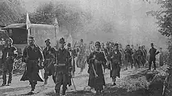The Germans attacked again on the Yser front on 30 October, overran the Belgian second line and reached Ramskapelle and Pervijze.[28] Belgian and French counter-attacks recovered Ramskapelle and the final attack, planned for the next day was called off when the Germans realised that the land behind them was flooding. The Germans withdrew in the night of 30/31 October.[29] On 10 November, Diksmuide fell and the fighting continued further south until 22 November, in the First Battle of Ypres.[30]