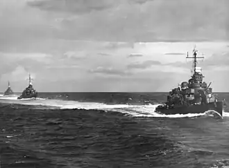 ![]() U.S. destroyers (from right to left): O'Bannon, Chevalier, and Taylor head towards Tulagi harbor in the Solomon Islands on 15 August 1943, two days before engaging in the Battle off Horaniu. | |||||||