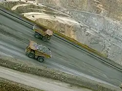 Batu Hijau is an open-pit mine. Ore is removed from the mining face using P&H 4100 electric shovels and loaded into Caterpillar 793C haul trucks (pictured). Each haul truck can move a payload 220 t (240 short tons) of ore. The trucks haul ore from the shovel to primary crushers. Crushed ore is sent by a conveyor 1.8 m (6 ft) wide and 6.8 km (4.2 mi) long to the mill. Daily production from the mine is an average of 600,000 t (660,000 short tons) ore and waste combined. Ore from the mine has an average copper grade of 0.49% and an average gold grade of 0.39g/t.[3]