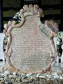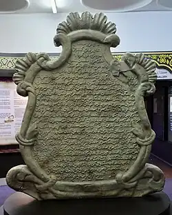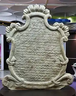 The Batu Tarsilah[a] (Genealogical Stone Tablet)[2][3] is a stone tablet listing the genealogy of Bruneian sultans from 1363 to 1804 CE,[4] in addition to historical records such as Malay manuscripts and oral narratives. The Batu Tarsilah, a stone inscription dating back to 1807, documents Brunei's royal ancestry and was commissioned by Sultans Muhyiddin and Husin Kamaluddin.[1] The tablet is regarded as the most trustworthy source for verifying Brunei's monarchy's ties to the Prophet Moḥammad's lineage (Ahl al-Bayt) and the Quraysh through comparative research based on Islamic genealogy, hence bolstering the legitimacy and sovereignty of Brunei's rulers. The historical and cultural grandeur of the sultanate is symbolised by this tablet.[5]