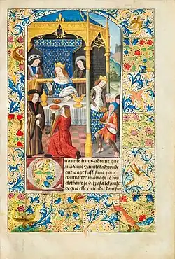 Baudonivia wrote her life of Radegund sometime between 599 and 614 at Chelles Abbey,[3] using a previous vita by Venantius Fortunatus and her own recollections of Radegund from her youth. She regarded her work as similar to half of a diptych. Baudonivia created a portrait of a devout yet politically shrewd woman who used her worldly power to sustain the monastery.[4] Her work has been characterized as faithful to the picture painted by Venantius Fortunatus, but more significantly influenced by the ideology of Caesarius of Arles's Regula Virginum with the clear purpose of providing a model of sanctity for the nuns of her generation. The work is focused on the later stages of Radegund's life, when Radegund lived in a cell near Poitiers. The book also includes miracles attributed to Radegund's intercession.