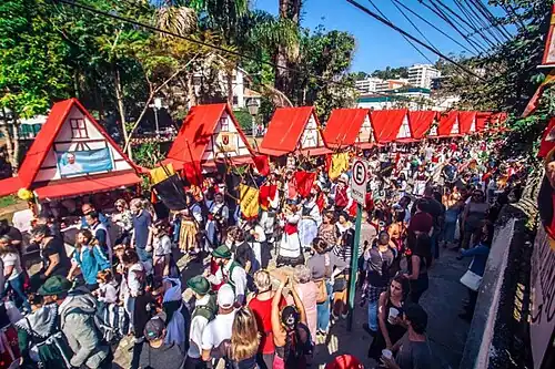 Since 1989 the Bauernfest has been held every year (except 2020) in the city center. It is considered the largest festival in the Petrópolis region, and the second largest German festival in Brazil,[2] behind the Oktoberfest of Blumenau, in Santa Catarina.[3] The festival features folk dances, choirs, traditional bands such as the Banda Musical Germânica (Germanic Musical Band) of Blumenau, contest beer drinking. Typical savory foods include sausages, Sauerkraut, Wurstsalat, Sauerbraten and so forth.