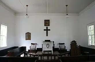 Upon entering the church, a single aisle leads through the center of the nave to the chancel, which is centered on the northwest wall of the church. Simple, stained pews fill the nave of the church. The chancel is raised on a pentagonal platform which is surrounded on three sides by a low communion rail with square balusters. The ends of the communion rail are accented with turned balusters. A second square platform is centered atop the lower on which the pulpit is situated. The walls of the church are covered in plaster with a broad base board and milled crown molding. The ceiling is covered with tongue-in-groove boards. A reed organ, produced by the Beckwith Organ Company of Chicago, IL sits to the side of the chancel.
