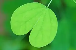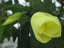 Yellow bauhinia is a small tree with a maximum height of 4 m (13 ft).[4] It has drooping slender branches with multiple scrambling stems. The bark is greyish, smooth, and sometimes hairy, which gives its specific name tomentosa. Greenish leaves are deeply divided and elliptic in nature; margin entire. Flowers are bell-shaped with large, yellow petals with a dark maroon patch at the base. The fruit is a pale-brown pod.[5] Extracts of the plant's roots have in vitro antimicrobial activity against Gram-positive bacteria.[6][7]