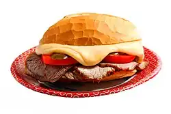 | Main ingredients | French bun with crumb removed, cheese (usually mozzarella), roast beef, tomatoes, pickled cucumbers |