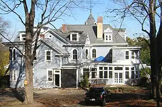 The Baxter–King House is a historic house at 36 Heritage Road in Quincy, Massachusetts. The 2+1⁄2-story wood-frame house was built in the 1860s, and is one of the city's finest Italianate houses. The L-shaped house dominated by a three-story square tower with a shallow hip roof that has a bracketed and modillioned eave. An elaborately decorated entry projects from the tower. Windows are varied in shape, including round-arch windows with drip moulding, and single and doubled sash windows. The house was built by James Baxter Jr., whose daughter Helen married Theophilus King. King owned a leather business in Boston and was president of the Granite Trust Company.[2]