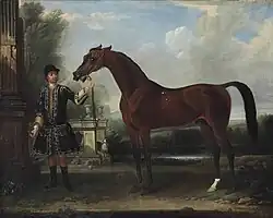 Bay Wanton, on Newmarket Heath with jockey up, 1725, by John Wootton, possibly a son of Bay Bolton and inscribed (but possibly not) 'The property of Charles Paulett, 3rd Duke of Bolton'. -
