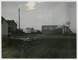 The picture shows the Bay Trail store complex at its zenith about 1960, just after the Saskatchewan rural electrification program.[11] From left to right: A bit of the "oil shed" (note a 45-gallon (200 L) gasoline drum teetering a bit on the platform), the Hiebert house with a tall TV aerial, the telephone pole in the foreground and the power pole with the transformer in the background, the white "flour shed" for large bags of flour, sugar and other non-perishables, another storage shed (hiding the "outhouse" behind), the new store built in 1952, a bit of the rounded front of the original store repurposed as a garage, and the new electric gasoline pumps.