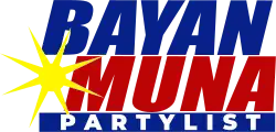 Bayan Muna (lit. 'Nation First') is a party-list in the Philippines, a member of the leftist political coalition Makabayan. The motto of the party is "New Politics, the Politics of Change", against "traditional, elitist, pro-imperialist politics".[1] Its platform includes the advocation of a government that progressively supports the working class, with meaningful representation of all democratic sectors in the Philippines. Bayan Muna was the second most popular party-list party in the 2007 Philippine elections. In 2009, Bayan Muna Representative Satur Ocampo and former Bayan Muna and incumbent Gabriela Representative Liza Maza ran for senate seats as guest candidates under the ticket of billionaire real estate magnate Senator Manny Villar. Ocampo said that their common objective “is to emancipate the people from widespread poverty and social injustice."[2]