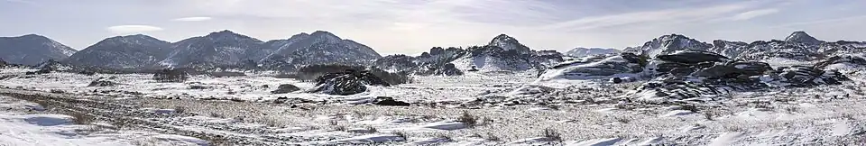 ![]() View of the granite landscape of Bayanaul National Park, with Bulka mountain to the right | |
