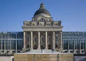 Bayerische Staatskanzlei is also the name of the building in Munich that houses the personal offices of the chancellery staff. It was erected from 1989 to 1993 around the central dome of the former Bavarian Army Museum, which had been built in 1905 at the site of the Hofgartenkaserne barracks and was demolished in World War II. The museum then was moved to the New Castle in Ingolstadt.