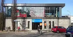At the same time, the glass-fronted south entrance building erected in the 1950s to replace the demolished original was rebuilt to a modernistic design, also by Rümmler.[4] Colourful art is mounted on the walls inside.[9]