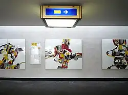 The lower-level U7 portion of the station, built to Rainer G. Rümmler's design in 1968–70 and opened in 1971, also makes use of the Bavarian colours: the walls are clad in blue fibre cement panels with the station name on a white horizontal stripe, and the support columns are white.[8] The ceiling, resembling skylights in industrial buildings, was designed to avoid dazzling train operators;[9] the fluorescent lights are inset in red piping.[8] The lobbies are decorated in contrasting colours: white, red and turquoise. The design resembles that at Eisenacher Straße, also by Rümmler.[9]