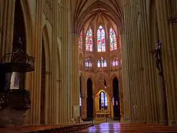The site was previously occupied by a Romanesque cathedral that was destroyed by two fires in 1258 and 1310.[1] Construction of the present cathedral began in the 13th century and was completed at the beginning of the 17th, except for the two spires which were not finished until the 19th century. The structure has been much restored and refurbished, notably by Émile Boeswildwald, architect to the French government in the 19th century, and a pupil of Eugène Viollet-le-Duc.[2]