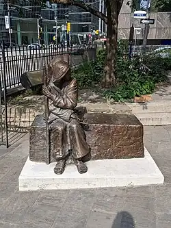 Be Welcoming is an interactive sculpture. The sculpture at first glance depicts a hooded figure, appearing to be a stranger, a traveler or a pilgrim. However, as the viewer walks around the sculpture and changes perspective, the figure is shown to be an angel with an outstretched hand motioning as if to invite the viewer to sit beside them.[3] The full sculpture includes the life-sized pilgrim-angel sculpture with a bronze bench large enough for an adult to sit upon.